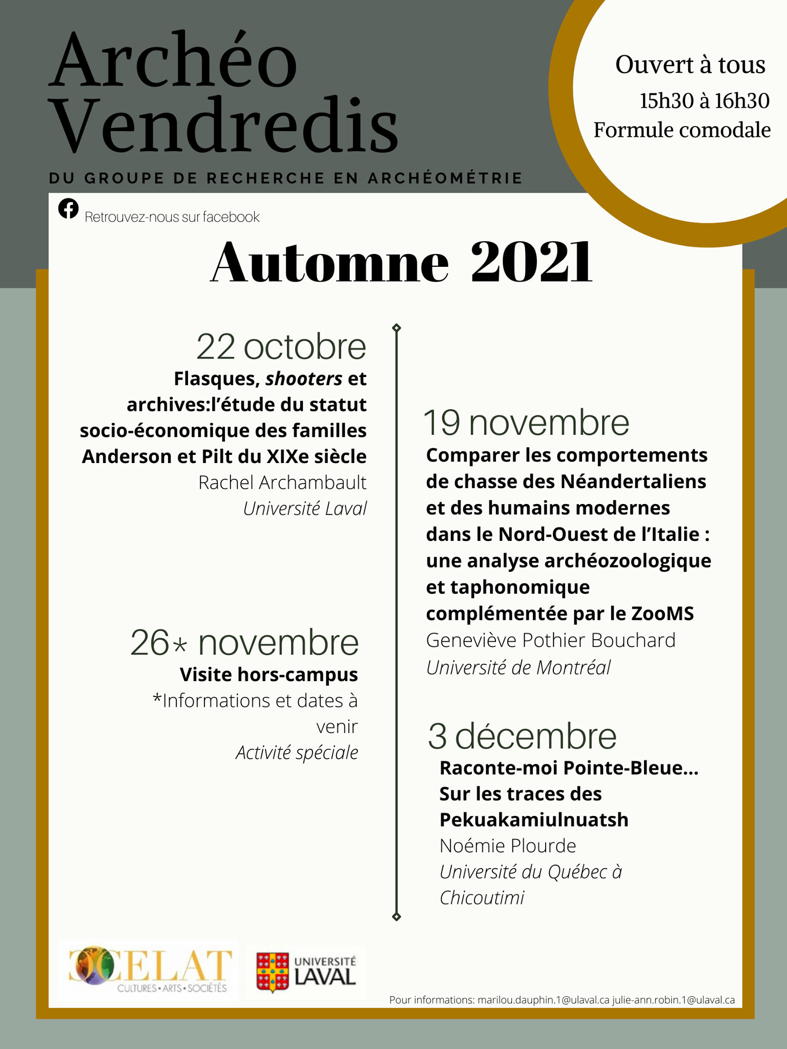 Plusieurs belles activités en formule comodale vous attendent cet automne dans le cadre des Archéo-vendredis. Rachel Archambault, membre étudiante du CELAT dirigée par Allison Bain, présentera la conférence « Flasques, shooters et archives : l’étude du statut socio-économique des familles Anderson et Pilt du XIXe siècle » le 22 octobre à 15 h 30 sur Zoom et au local 1466 du pavillon Charles-De Koninck à l’Université Laval.
