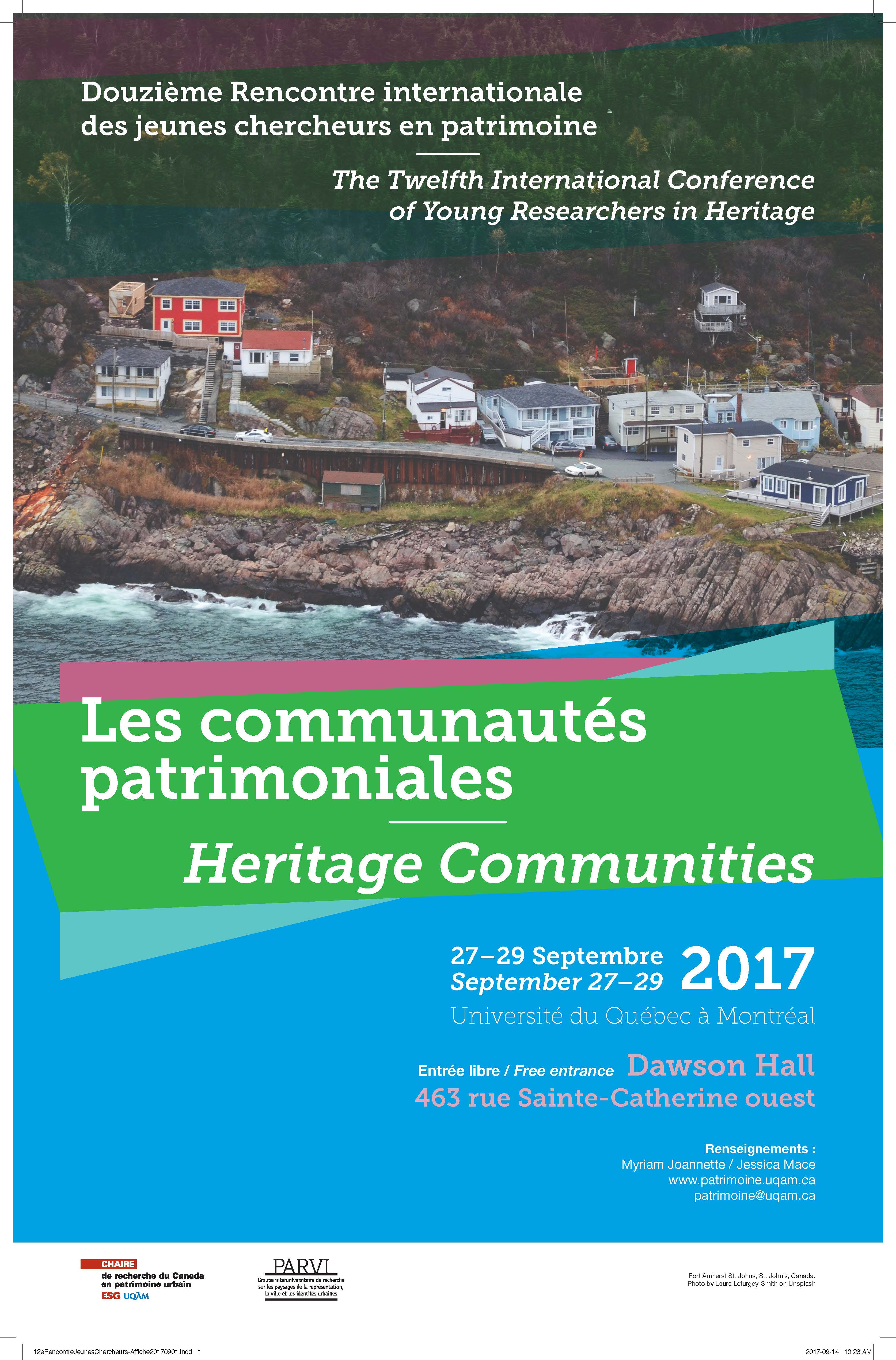 Du 27 au 29 septembre prochain, Jessica Mace, stagiaire postdoctorale à la Chaire de recherche du Canada et au CELAT, et Myriam Joanette, doctorante au CELAT sous la direction de Lucie K. Morisset organisent la douzième rencontre internationale des jeunes chercheurs en patrimoine. Cette 12ème édition se fera autour de la thématique des communautés patrimoniales et débutera avec le lancement du livre Le spectacle du patrimoine, sous la direction de Guillaume Éthier, le 27 septembre à 17h30 (Gingko Café-Bar, 308, rue Ste-Catherine est). Des communications seront ensuite présentées durant deux jours, les 28 et 29, au Dawson Hall, 463, rue Ste-Catherine ouest, de 9h00 à 14h00. Le 29 en après-midi, un tour de l’église Sainte-Brigide est organisé.