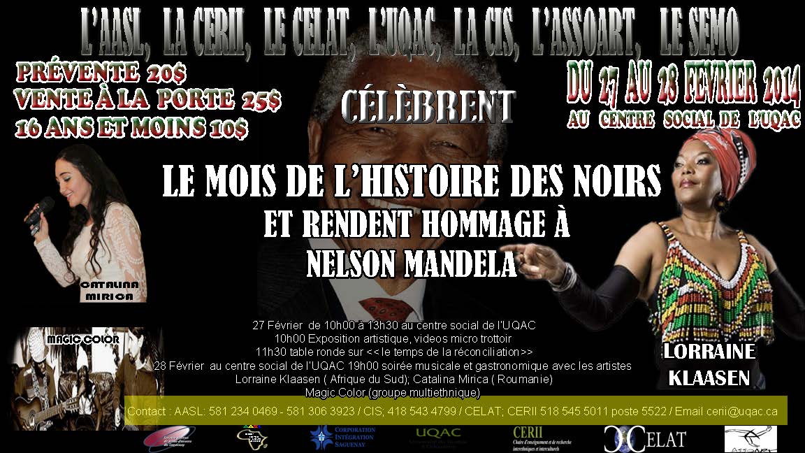 Dans le cadre du Mois de l’histoire des Noirs, l’AASL, la CERII, le CELAT, l’UQAC, la CIS, l’ASSOART et le SEMO, organise un hommage à Nelson Mandela. Au programme une exposition artistique, des vidéos micro trottoir, une table ronde sur le temps de la réconciliation et une soirée musicale et gastronomique avec les artistes