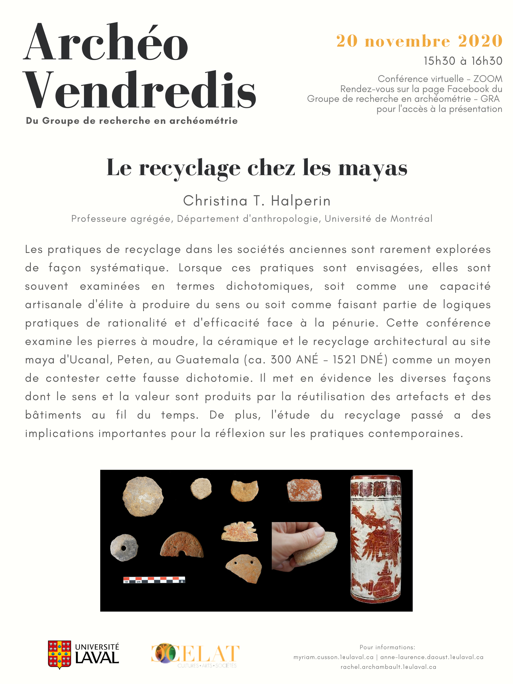 Pour le 2e Archéo Vendredi de la session, le Groupe de recherche en archéométrie reçoit Christina Halperin, professeure agrégée à l’Université de Montréal, le vendredi 20 novembre à 15h30 pour une conférence intitulée « Le recyclage chez les Mayas« . Le lien Zoom pour la conférence sera diffusé sur la page Facebook du groupe.