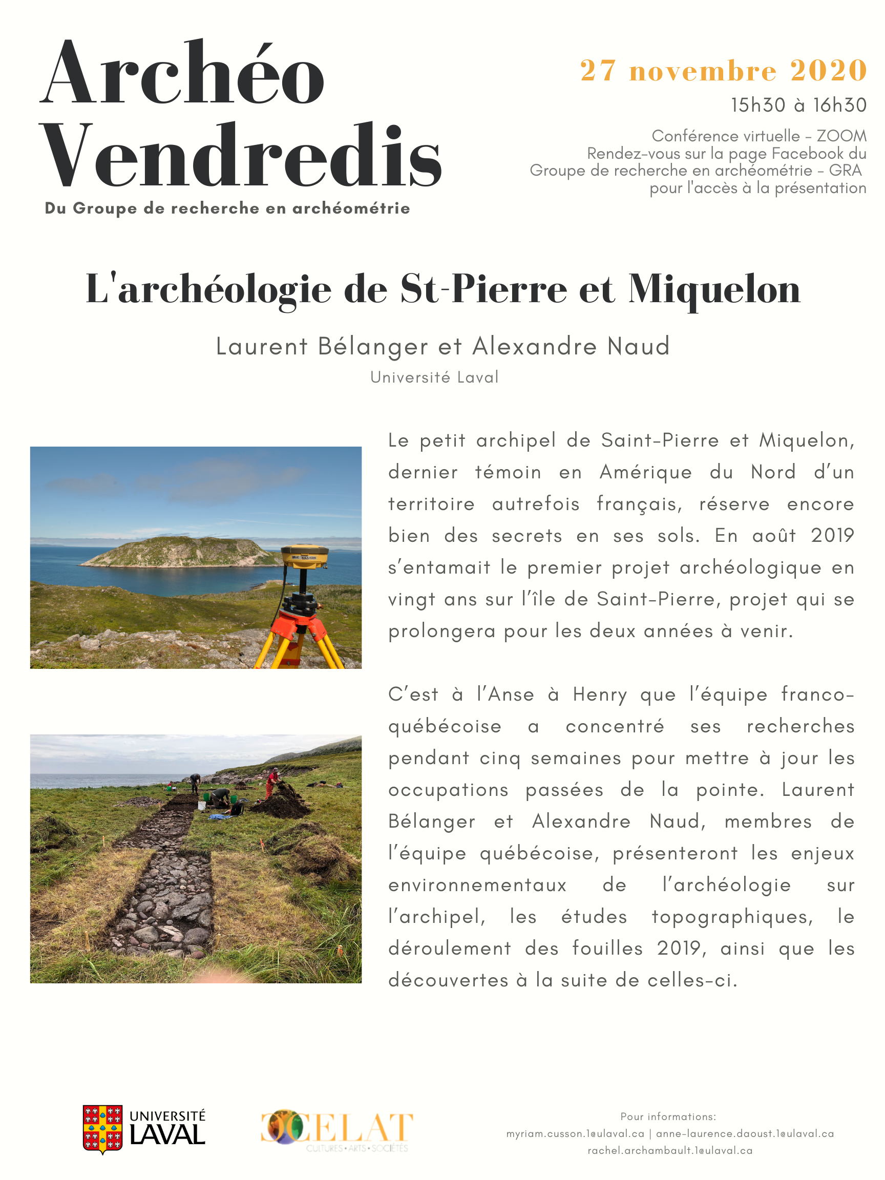 Le prochain Archéo-vendredi portera sur le thème « L’archéologie de St-Pierre et Miquelon », le vendredi 27 novembre 2020 à 15h30. Laurent Bélanger et Alexandre Naud, tous deux affiliés à l’Université Laval, sont les conférenciers invités.