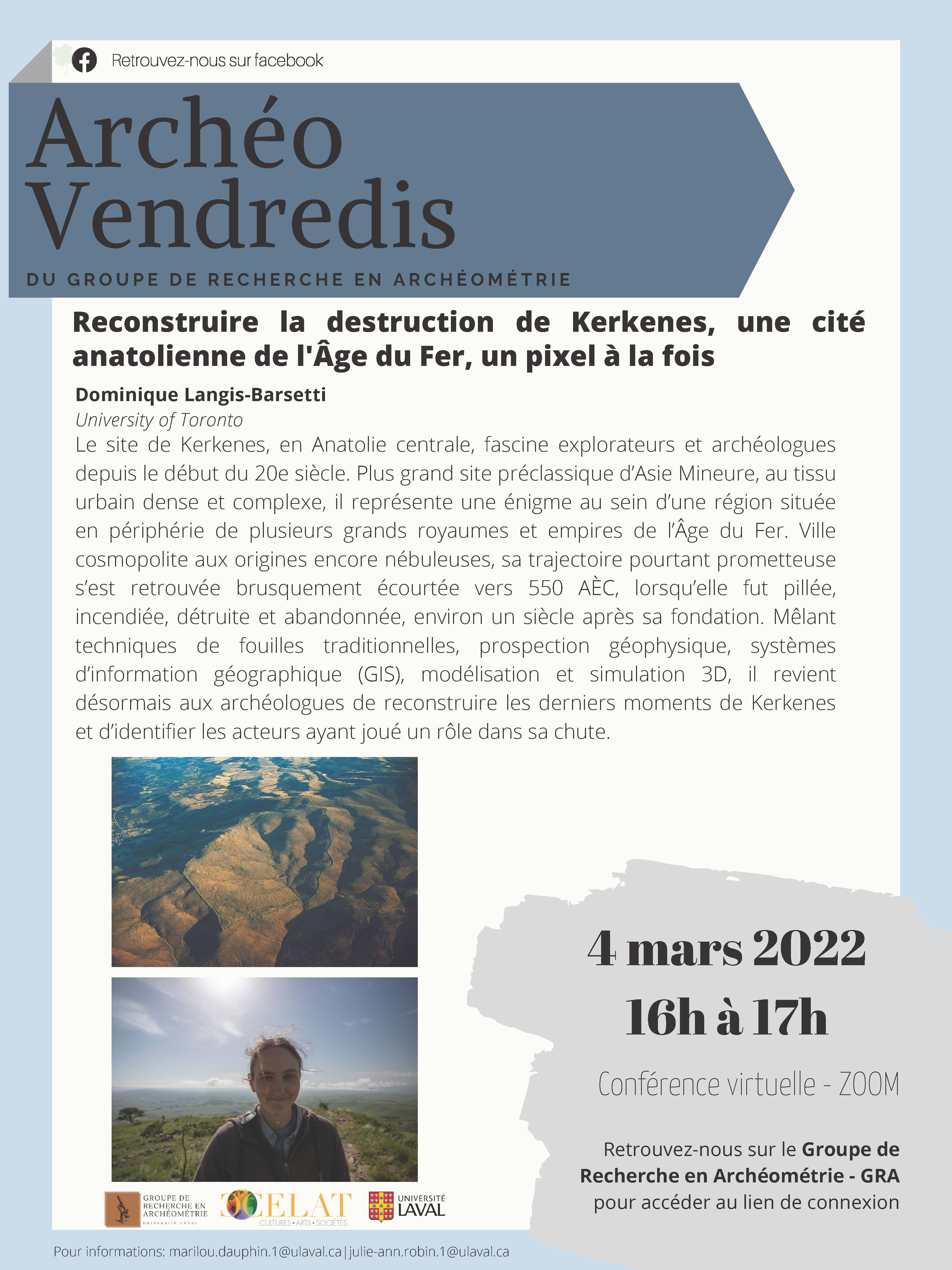 Dans le cadre de la programmation hivernale des Archéo-vendredis, vous êtes convié.e.s à une conférence virtuelle de Dominique Langis-Barsetti intitulée « Reconstruire la destruction de Kerkenes, une cité anatolienne de l’Âge du Fer, un pixel à la fois » ce vendredi 4 mars à 16 h.