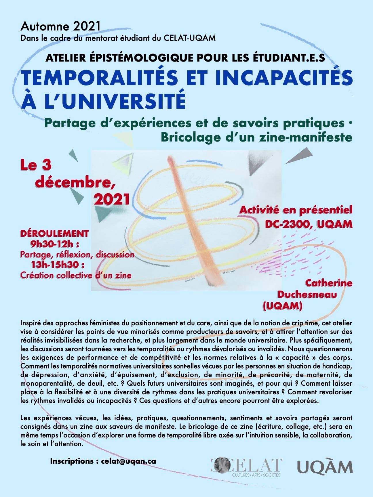 Dans le cadre des activités du mentorat étudiant du CELAT-UQAM, dont est responsable Eli C. Carreón (membre étudiant.e du centre dirigé.e par Véronique Leduc), la doctorante Catherine Duchesneau (dirigée par Magali Uhl) a animé le vendredi 3 décembre 2021 l’atelier épistémologique « Temporalités et incapacités à l’université : partage d’expériences et de savoirs pratiques • bricolage d’un zine-manifeste ».
