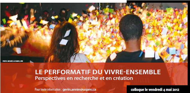 Organisé sous la direction de Annie Gérin, ce colloque se consacre à la performativité du vivre-ensemble et aux perspectives en recherche et en création et regroupe les chercheurs du CÉLAT liés à cet axe de recherche : Mouloud Boukala, Pierre Ouellet, Jean-Paul Quéinnec, Constanza Camelo-Suarez, Francine Saillant, Ève Lamoureux, Simon Harel, Michaël La Chance, Yves Bergeron, et bien sûr, Annie Gérin.
