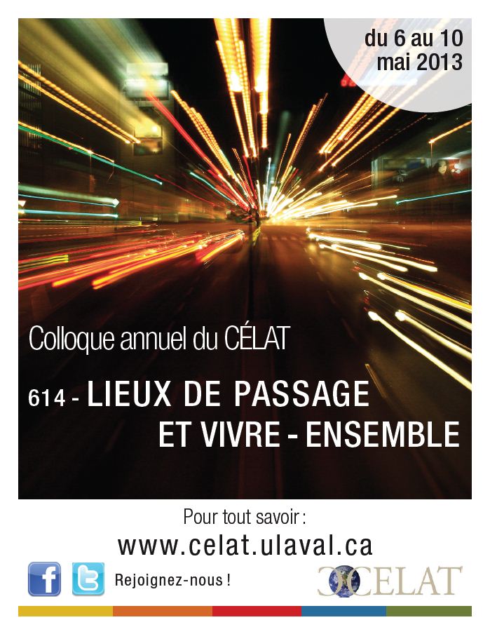Le CÉLAT organise son colloque annuel sur le thème « Lieux de passage et vivre-ensemble » lors du 81e congrès de l’ACFAS qui se tiendra à l’Université Laval du 6 au 10 mai 2013. D’une durée de cinq jours, tous les participants aborderont ce thème à travers les discours du savoir, la reconstruction des frontières normatives (politique, corps, religions, mobilité), l’aménagement rural ou périurbain, les sites patrimoniaux en crise et la performativité dans l’espace publique ou scientifique (art urbain, scénographie, audiovision).
