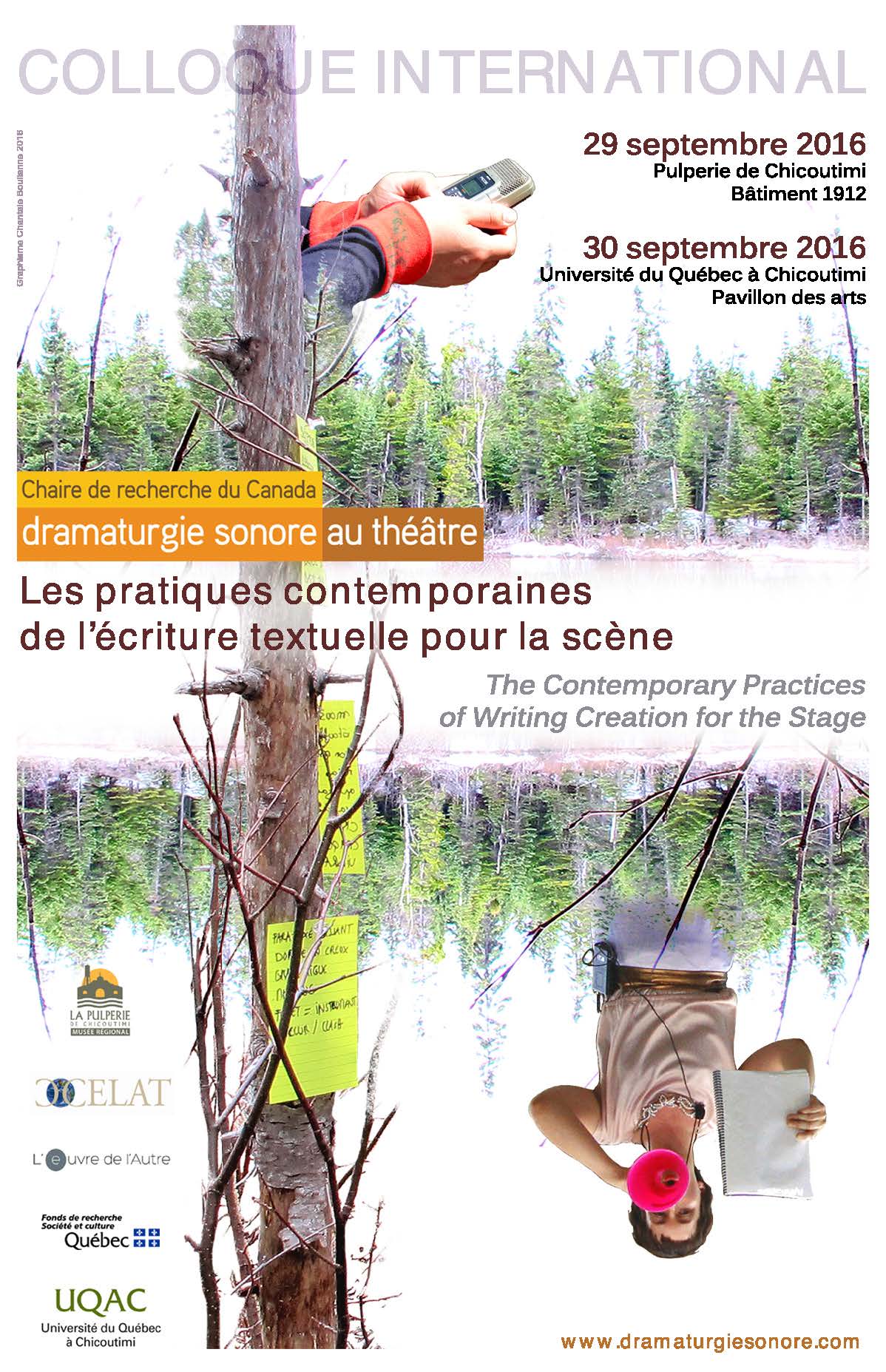 Du 28 au 30 septembre 2016, à l’UQAC, la Chaire de recherche du Canada en dramaturgie sonore au théâtre, dirigée par Jean-Paul Quéinnec (CÉLAT), organise un colloque international « Les pratiques contemporaines de l’écriture textuelle pour la scène » faisant suite à trois années de recherche sur l’approche sonore et performative de l’écriture dramatique. Pour cet événement, maints conférenciers sont attendus, dont plusieurs du CÉLAT : Simon Harel, Marie-Ève Bradette, Chantale Boulianne, Elaine Juteau, et d’anciennes membres dont Anick Martel et Andrée-Anne Giguère.