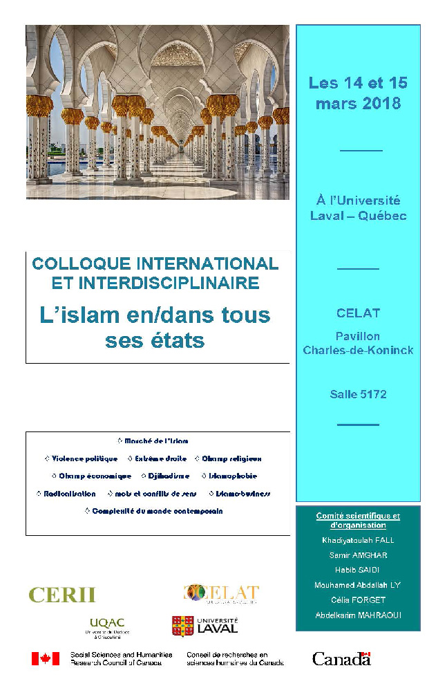 Les mercredi 14 et jeudi 15 mars 2018, à l’Université Laval, Khadiyatoulah Fall (CELAT) et Samir Amghar, ancien stagiaire postdoctoral du CELAT, organisent un colloque international et interdisciplinaire sur le thème « L’islam en/dans tous ses états« . Le colloque, réunissant une dizaine de chercheurs internationaux spécialistes de cette question, sera articulé autour de deux thématiques, «la violence politique » et le « libéralisme économique et sa relation au croire islamique », et tentera d’illustrer comment l’islam, sous plusieurs aspects, se révèle comme un espace de créativité en phase avec la complexité du monde contemporain.