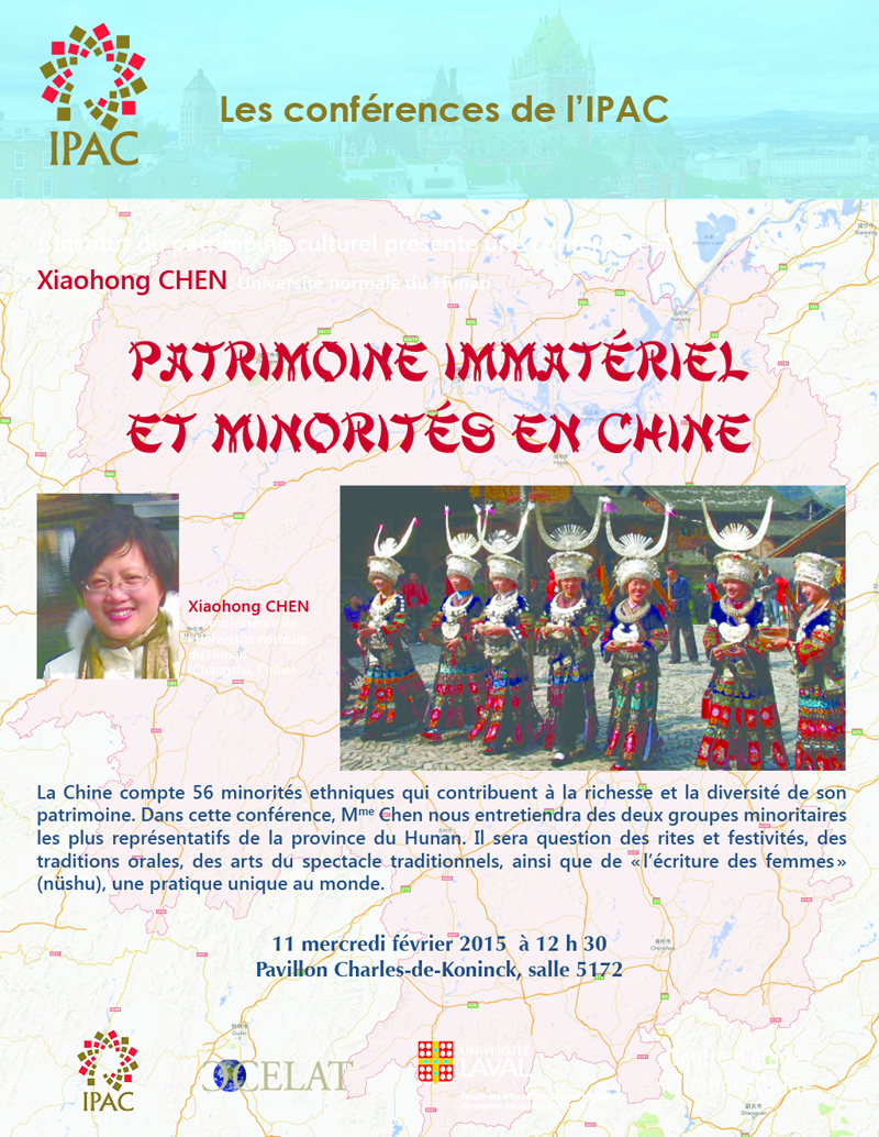 La Chine compte 56 minorités ethniques qui contribuent à la richesse et la diversité de son patrimoine. Dans cette conférence, Mme CHEN nous entretiendra des deux groupes minoritaires les plus représentatifs de la province de Hunan. Il sera question des rites et festivités, des traditions orales, des arts du spectacle traditionnels, ainsi que de « l’écriture des femmes » (nüshu), une pratique unique au monde.