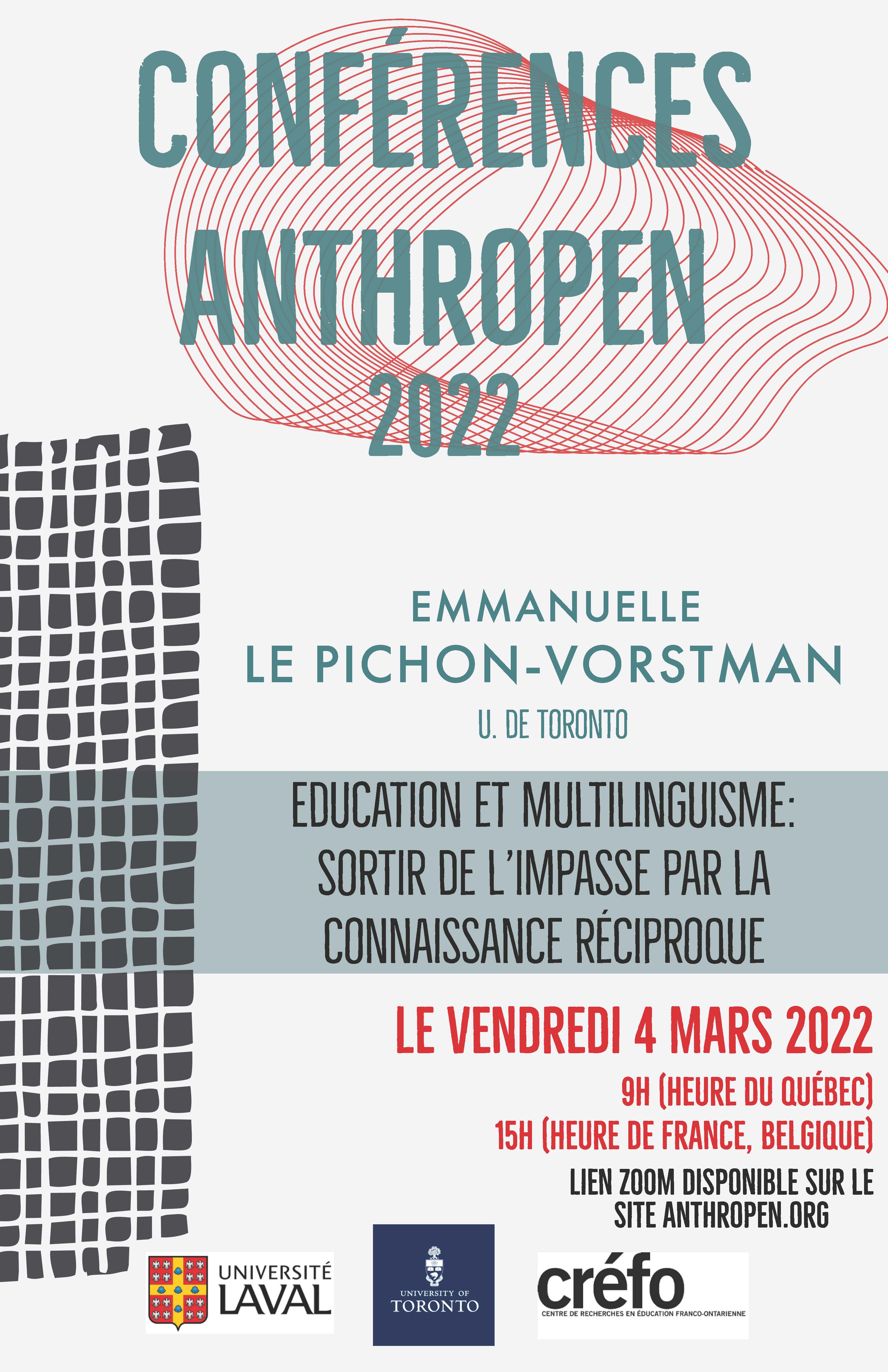 L’équipe de la direction d’Anthropen vous invite à assister, le vendredi 4 mars 2022 à 9 h, à une conférence virtuelle d’Emmanuelle Le Pichon-Vorstman (Université de Toronto, CREFO) intitulée « Éducation et multilinguisme : sortir de l’impasse par la connaissance réciproque ». Il s’agit de la quatrième activité du cycle de conférences Anthropen 2021-2022.
