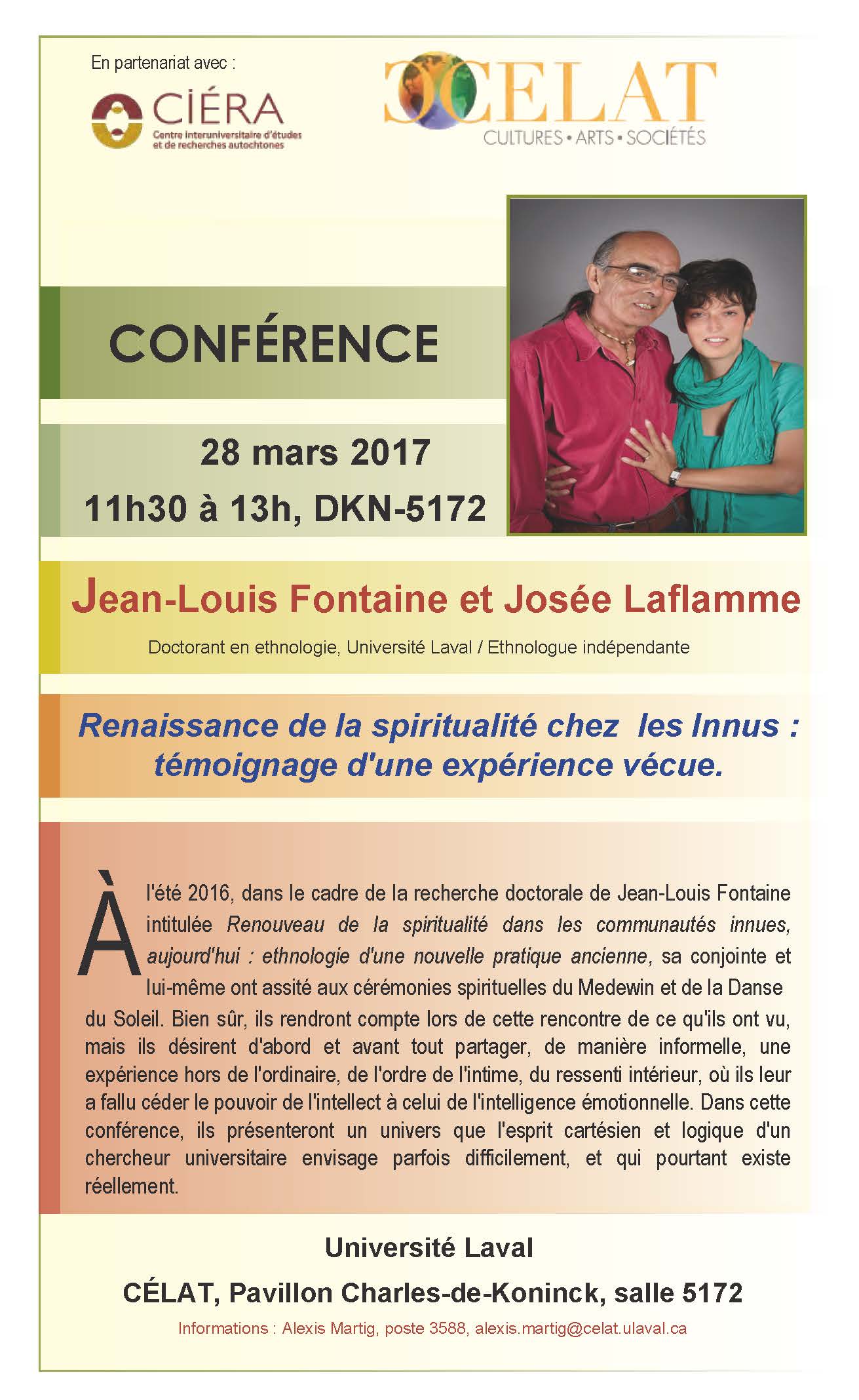 Le mardi 28 mars 2017, de 11h30 à 13h au Pavillon Charles-de-Koninck, local 5172, le CELAT UL, en partenariat avec le CIERA, accueillera Jean-Louis Fontaine et Josée Laflamme, respectivement doctorant en ethnologie à l’Université Laval et ethnologue indépendante pour une conférence intitulée » Renaissance spirituelle chez les Innus : témoignage d’une expérience vécue « .