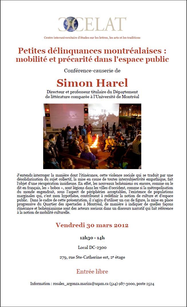 Simon Harel entend interroger la manière dont l’itinérance, cette violence sociale qui se traduit par une désolidarisation du sujet collectif, la mise en cause de toutes intersubjectivité empathique, fait l’objet d’une récupération insidieuse. En effet, les nouveaux bohémiens ou encore, comme on le dit en français, les « bobos », sont légions dans les villes d’occident, comme si la métropolisation du monde engendrait, sous l’aspect de périphéries acceptables, l’existence de populations marginales qui, c’est son hypothèse, contribuent à redéfinir la notion de culture et d’espace public. Dans le cadre de cette présentation, il s’agira d’utiliser un cas de figure, la mise en place progressive du Quartier des spectacles à Montréal, de manière à indiquer de quelles façons itinérance et bohémianisme sont des acteurs sociaux dans un discours narratif qui fait référence à la notion de mobilité culturelle.