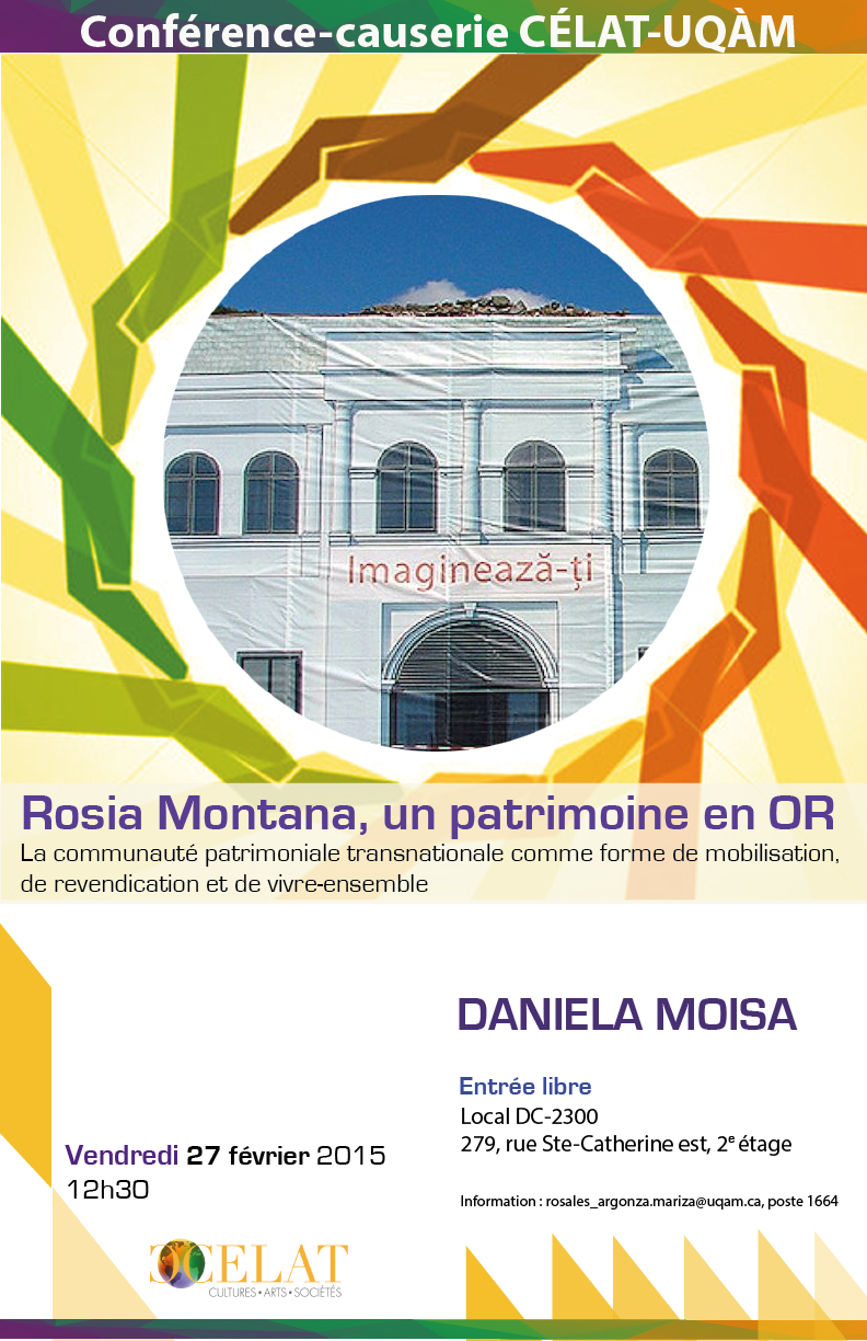 À l’automne 2013, le gouvernement roumain a déposé un projet de loi facilitant à une corporation minière canadienne et roumaine d’exploiter le plus important gisement d’or de l’Europe, Rosia Montana, se trouvant sur un territoire qui fait partie du patrimoine archéologique et culturel roumain du fait de plusieurs kilomètres de galeries minières datant des époques romane, médiévale et moderne, de localités villageoises ancestrales et d’un patrimoine naturel remarquable. Ces initiatives ont déclenché une crise sociale et politique d’envergure qui a transporté le projet minier Rosia Montana à l’avant-scène au niveau national et international. Le mouvement populaire exigeait dorénavant la sauvegarde du patrimoine matériel et immatériel de Rosia Montana, la protection du paysage et du patrimoine naturel, la mise en place de mesures visant le développement d’une économie culturelle durable et locale et l’inscription du site à l’UNESCO. Les mobilisations sociales ont acquis une dimension transnationale grâce aux manifestations de la diaspora roumaine dans une quarantaine de villes à travers le monde, dont Montréal. Des manifestations ont eu lieu pendant plusieurs fins de semaine dans la métropole et ont dépassé les attentes de la diaspora roumaine : des sympathisants originaires d’Amérique du Sud et d’Afrique, des régions touchées par des projets miniers y ont participé pour appuyer les revendications de la population roumaine.