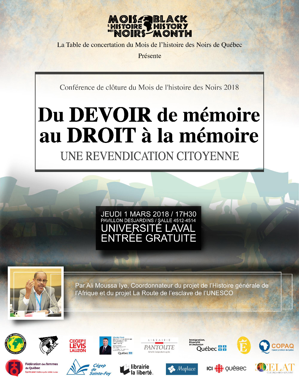 Le CELAT est fier partenaire du Mois de l’histoire des Noirs du Québec et contribue à la clôture de cet événement en invitant M. Moussa Iye, coordonnateur du projet de l’Histoire générale de l’Afrique et du projet La Route de l’esclave de l’UNESCO, pour une conférence intitulée « Du DEVOIR de mémoire au DROIT à la mémoire. Une revendication citoyenne« , le jeudi 1er mars à 17h30 à l’Université Laval, pavillon Desjardins, Le Cercle, salle 4512-4514. Cette conférence, organisée en collaboration avec la Table de concertation du Mois de l’histoire des Noirs et le COPAQ, sera suivie d’un cocktail au cours duquel des prix reconnaissance seront remis aux organismes et personnalités qui se sont démarqués par leurs réalisations et leurs implications en société. Ouvert à tous.