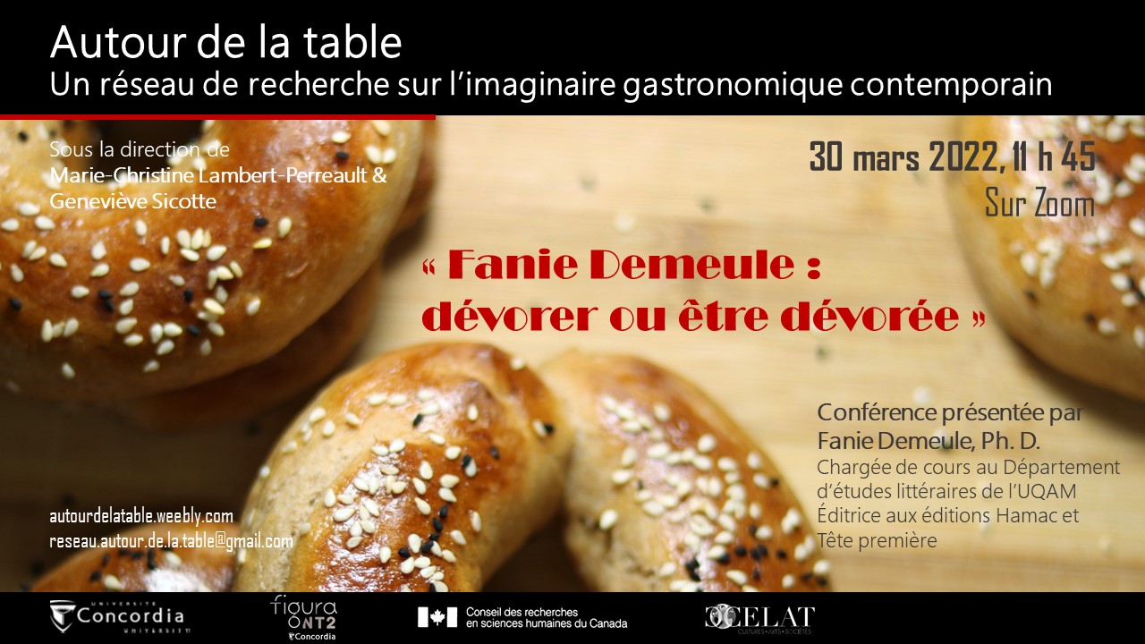 L’autrice Fanie Demeule (Ph. D., chargée de cours au Département d’études littéraires de l’Université du Québec à Montréal, éditrice aux éditions Hamac et Tête première) présentera sur Zoom la conférence « Fanie Demeule : dévorer ou être dévorée » le mercredi 30 mars à 11 h 45. La conférence portera sur ses œuvres et sur les fils conducteurs qui les traversent (l’obsession, la dévoration, l’aliment, le corps, etc.).