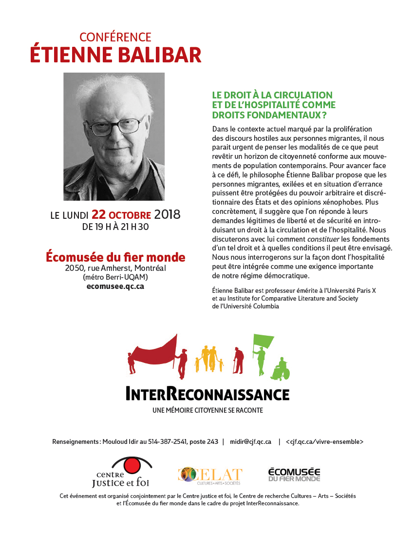 En collaboration avec l’Éconmusée du fier monde et le Centre Justice et fois, le CELAT – UQAM est fier de recevoir Étienne Balibar, professeur émérite de l’Université Paris X et au Institute for Comparative Literature and Society de l’Université Colombia, le lundi 22 octobre 2018, de 19h à 21h30, pour une conférence intitulée « Le droit à la circulation et de l’hospitalité comme droits fondamentaux?« . Cette conférence, qui fait suite au projet InterReconnaissance dirigé par Francine Saillant, se déroulera à l’Écomusée du fier monde, 2050 rue Amherst à Montréal (métro Berri-UQAM). Ouvert à tous.