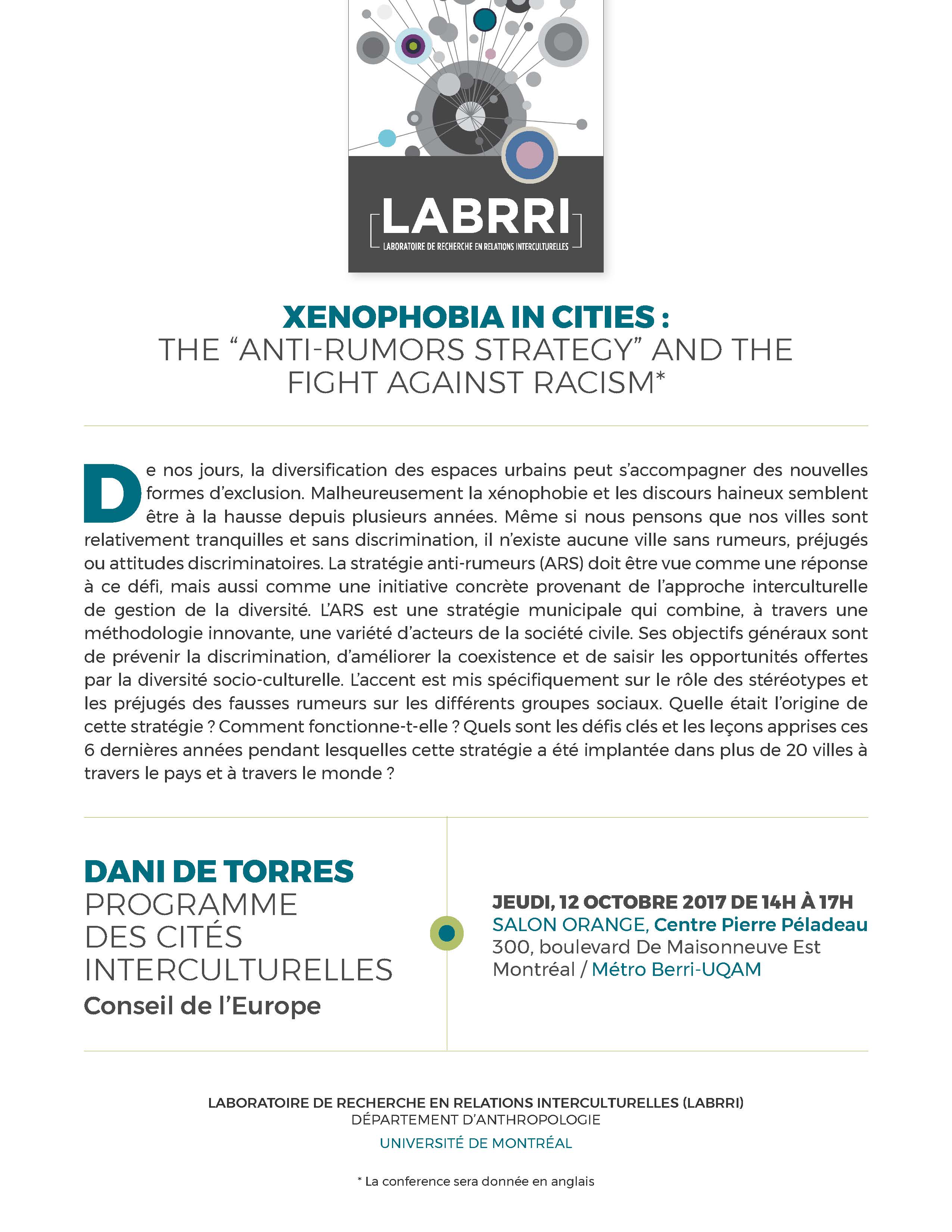 Jeudi 12 octobre 2017, le Laboratoire de Recherche en Relations Interculturelles (LABRRI) dirigé par Bob White, accueille pour une conférence Dani De Torres expert au Conseil de l’Europe. La communication intitulée « Xenophonia in Cities : The « Anti-Rumors Strategy » and The Fight Against Racism » aura lieu de 14h à 17h, au Salon Orange du Centre Pierre Péladeau au 300 Boulevard De Maisonneuve Est à Montréal.
