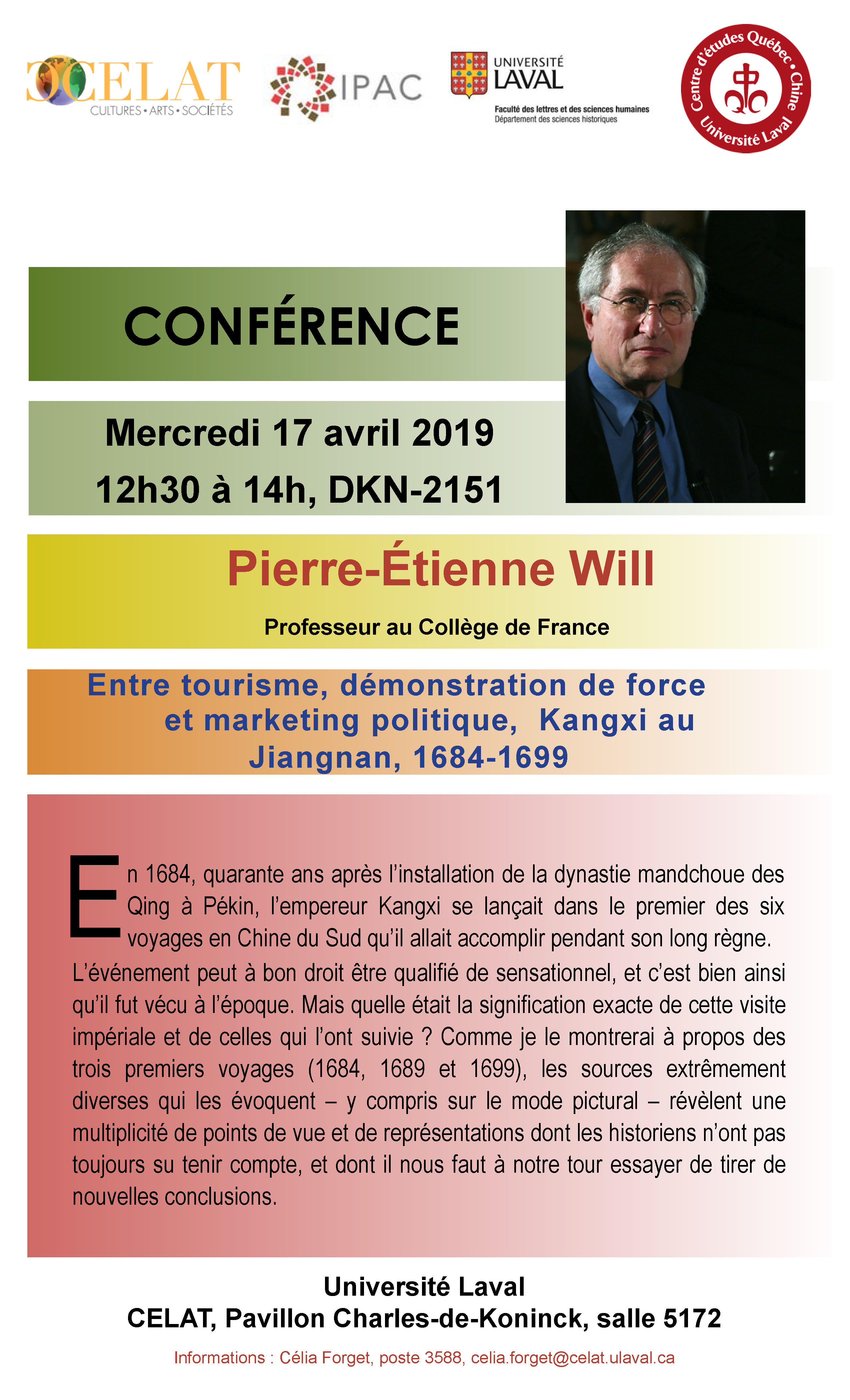 Le CELAT-UL vous invite à une conférence de Pierre-Étienne Will, historien français de la Chine moderne et professeur honoraire au Collège de France. « Entre tourisme, démonstration de force et marketing politique, Kangxi au Jiangnan, 1684-1699. » Le mercredi 17 avril 2019, de 12 h 30 à 14 h à l’Université Laval, pavillon Charles De-Koninck, local 2151 (Tribunal école). Ouvert à tous