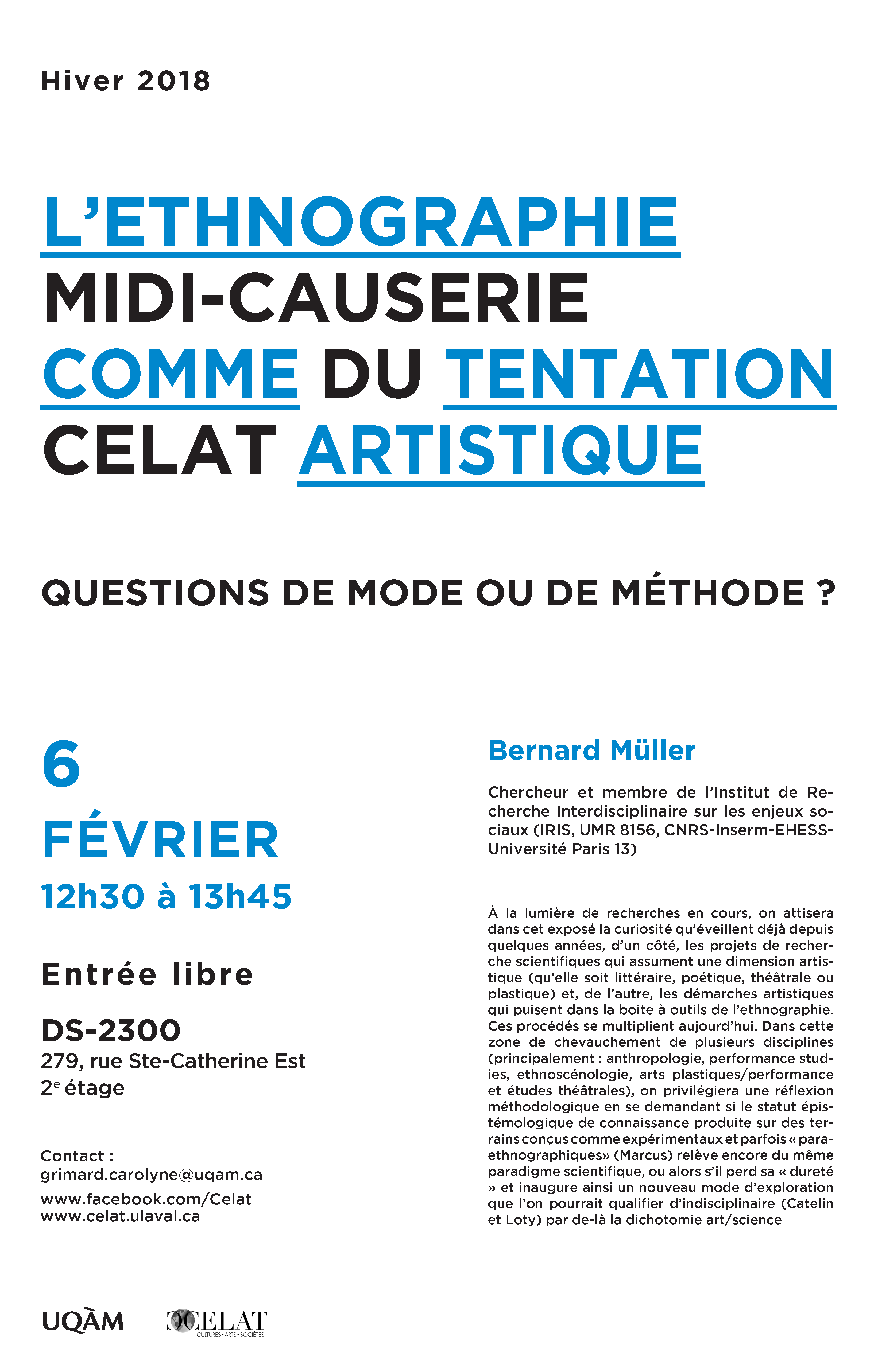 Le mardi 6 février de 12h30 à 13h45, le CÉLAT à l’UQAM reçoit Bernard Müller, chercheur et membre de l’Institut de Recherche Interdisciplinaire sur les enjeux sociaux, pour une conférence intitulée « L’ethnographie comme tentation artistique. Questions de mode ou de méthode? ». Cette conférence se déroulera à l’UQAM, au DC-2300, 279 rue Ste-Catherine Est, 2e étage, et est ouverte à tous.