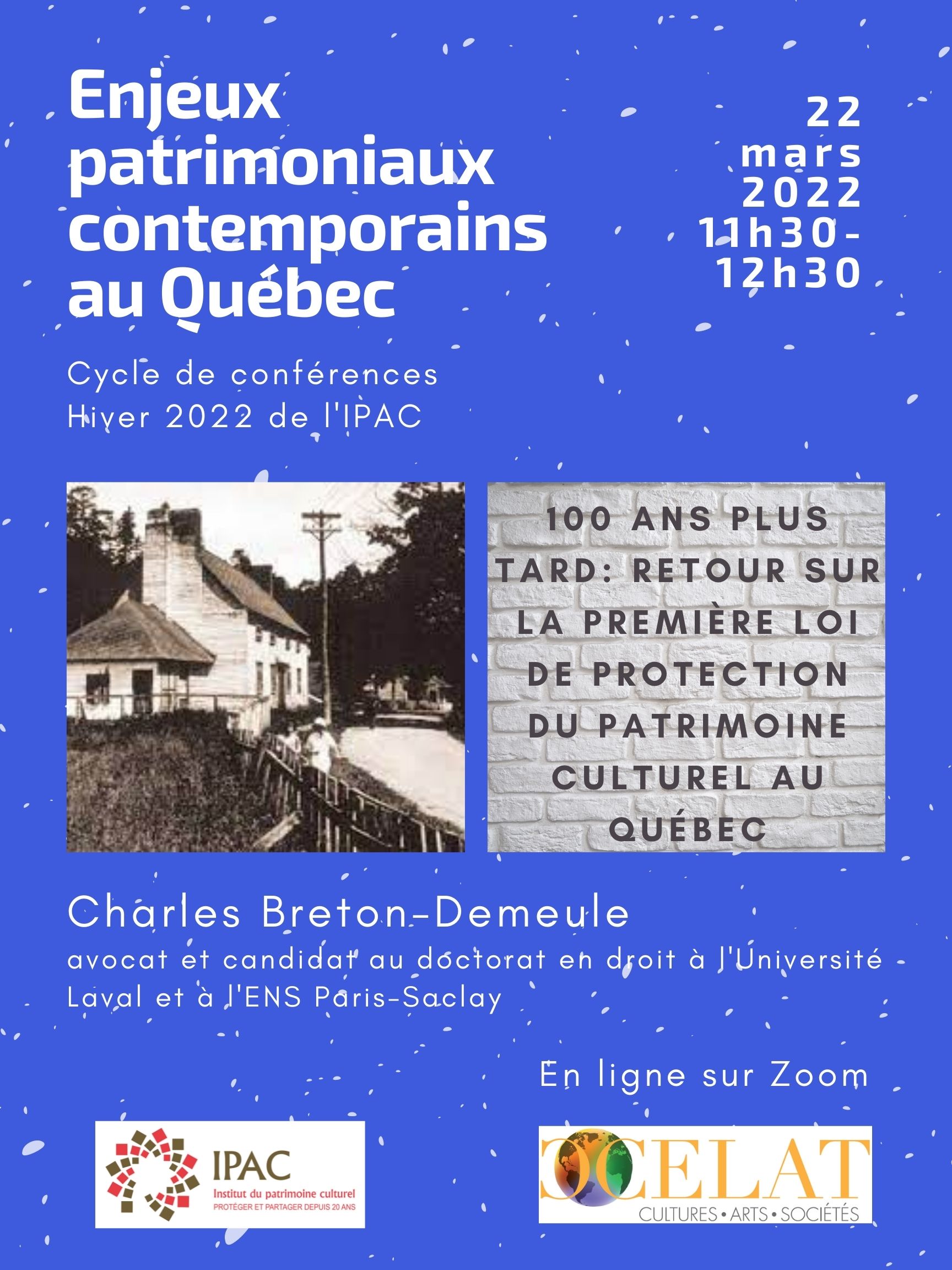 Charles Breton-Demeule présentera la conférence virtuelle « 100 ans plus tard : retour sur la première loi de protection du patrimoine culturel au Québec » le mardi 22 mars à 11 h 30, dans le cadre du cycle de conférences « Enjeux patrimoniaux contemporains au Québec », organisé par l’IPAC, en collaboration avec le CELAT.