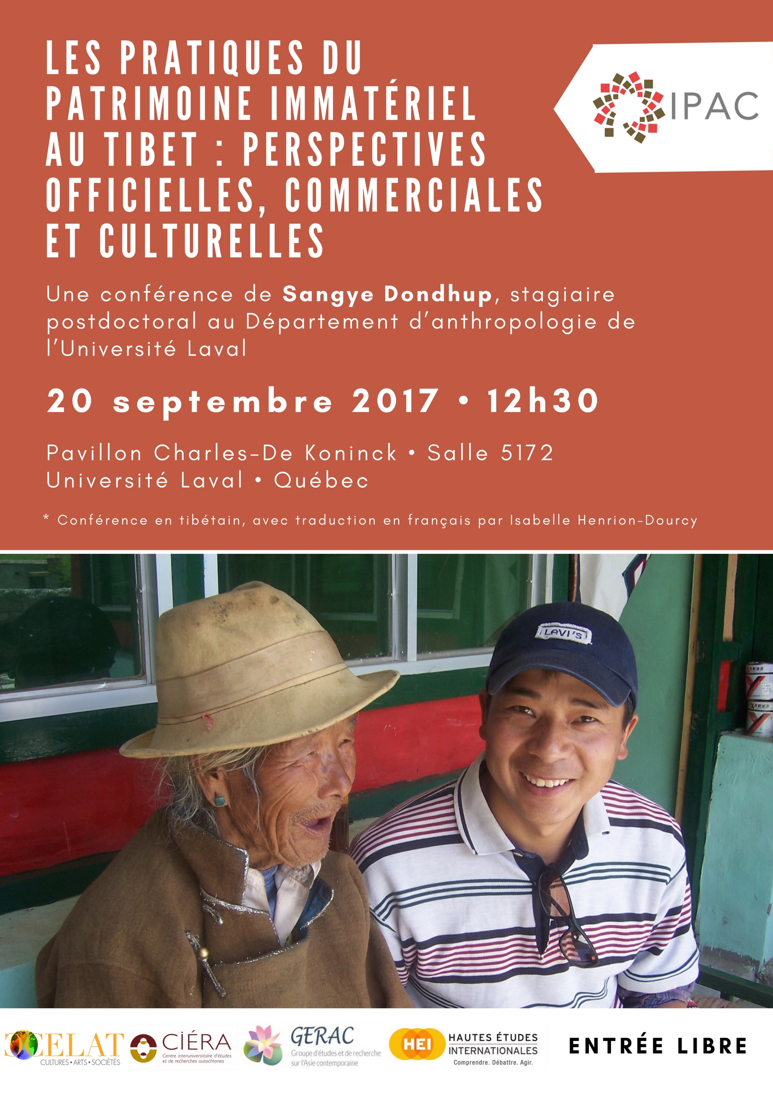 Le mercredi 20 septembre prochain, à 12h30 salle DKN-5172, l’IPAC accueillera pour une conférence sur le patrimoine immatériel au Tibet, Sangye Dondhup, stagiaire postdoctoral au département d’anthropologie de l’Université Laval. La conférence sera donnée en tibétain avec une traduction en français, et s’intitule : Les pratiques du patrimoine immatériel au Tibet : perspectives officielles, commerciales et culturelles.
