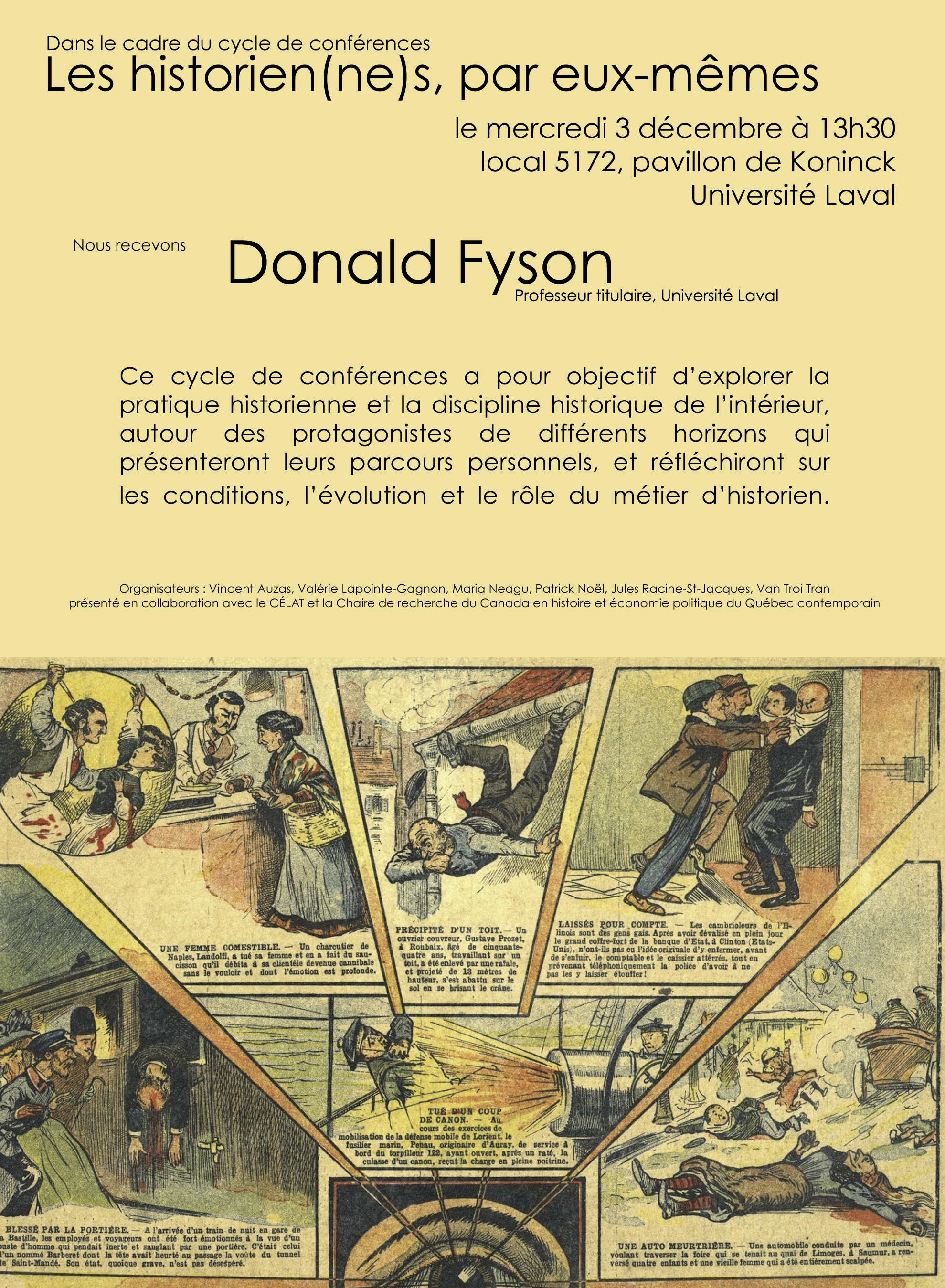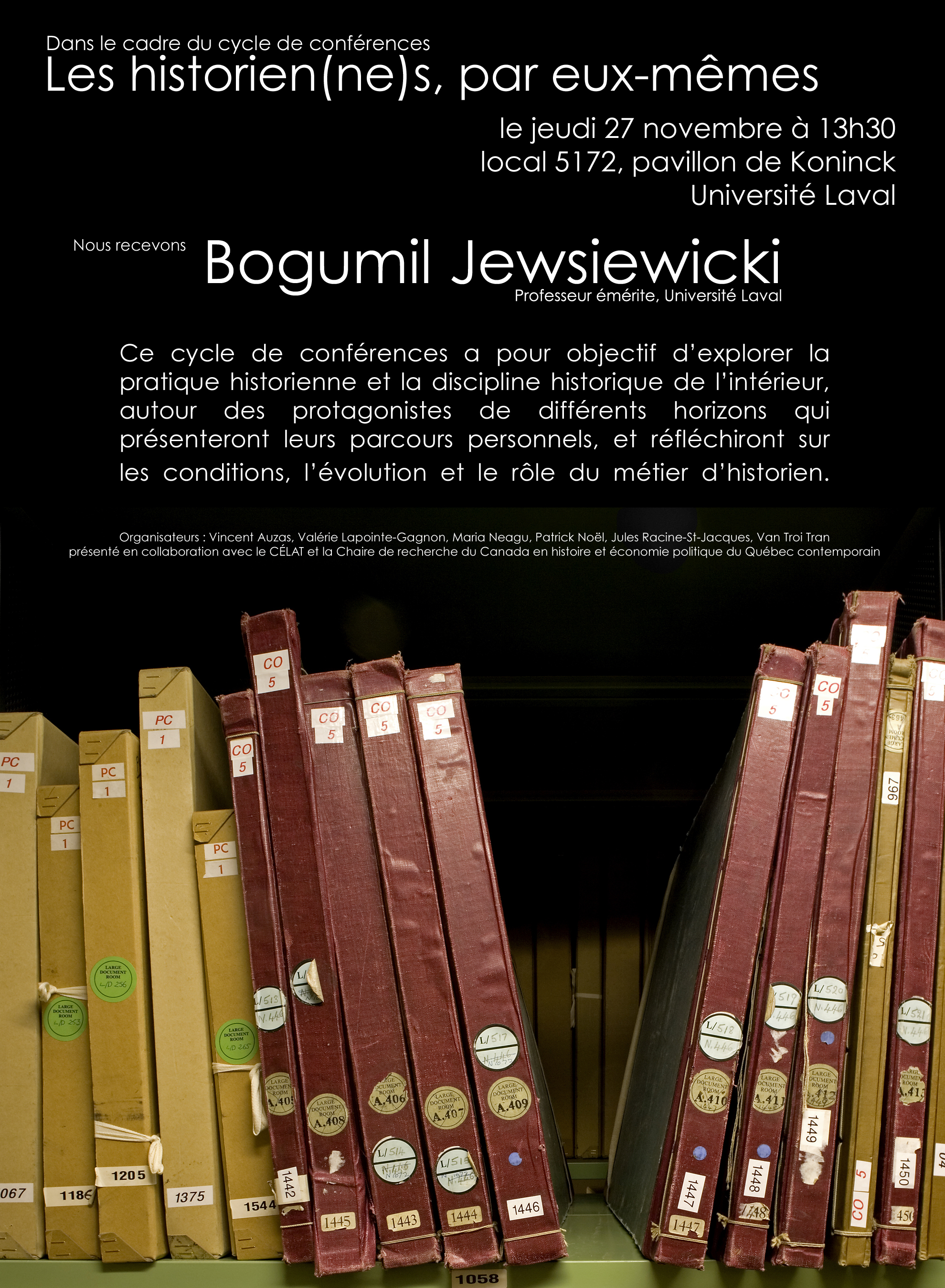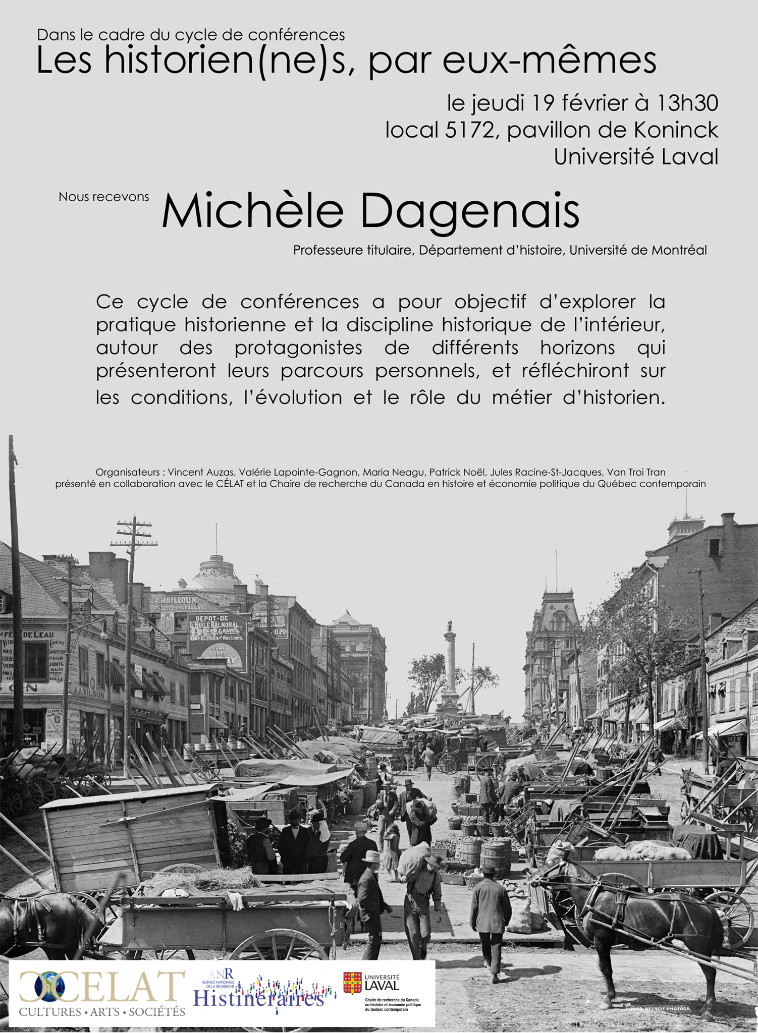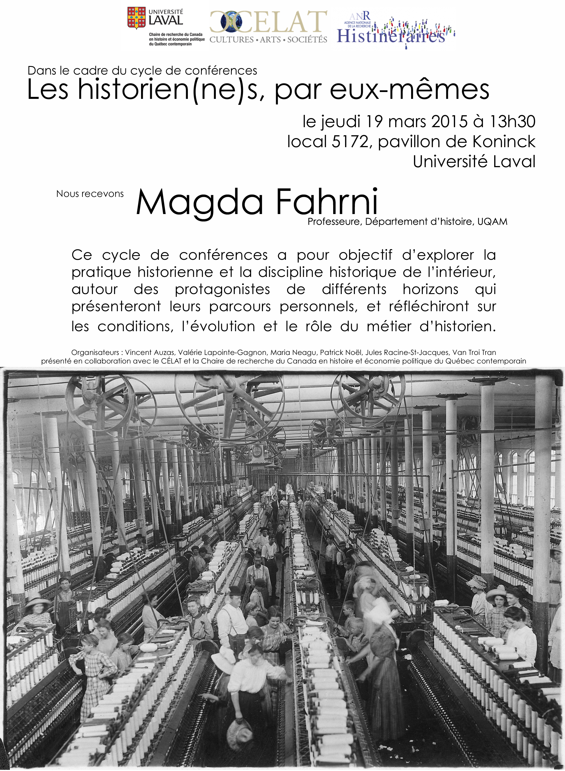 Ce cycle de conférences a pour objectif d’explorer la pratique historienne et la discipline historique de l’intérieur, autour des protagonistes de plusieurs horizons qui présenteront leurs parcours personnels, et réfléchiront sur les conditions, l’évolution et le rôle du métier d’historien. Il est organisé en partenariat avec le CÉLAT, la Chaire de recherche du Canada en histoire contemporaine du Québec et le projet ANR « Histinéraires ».
