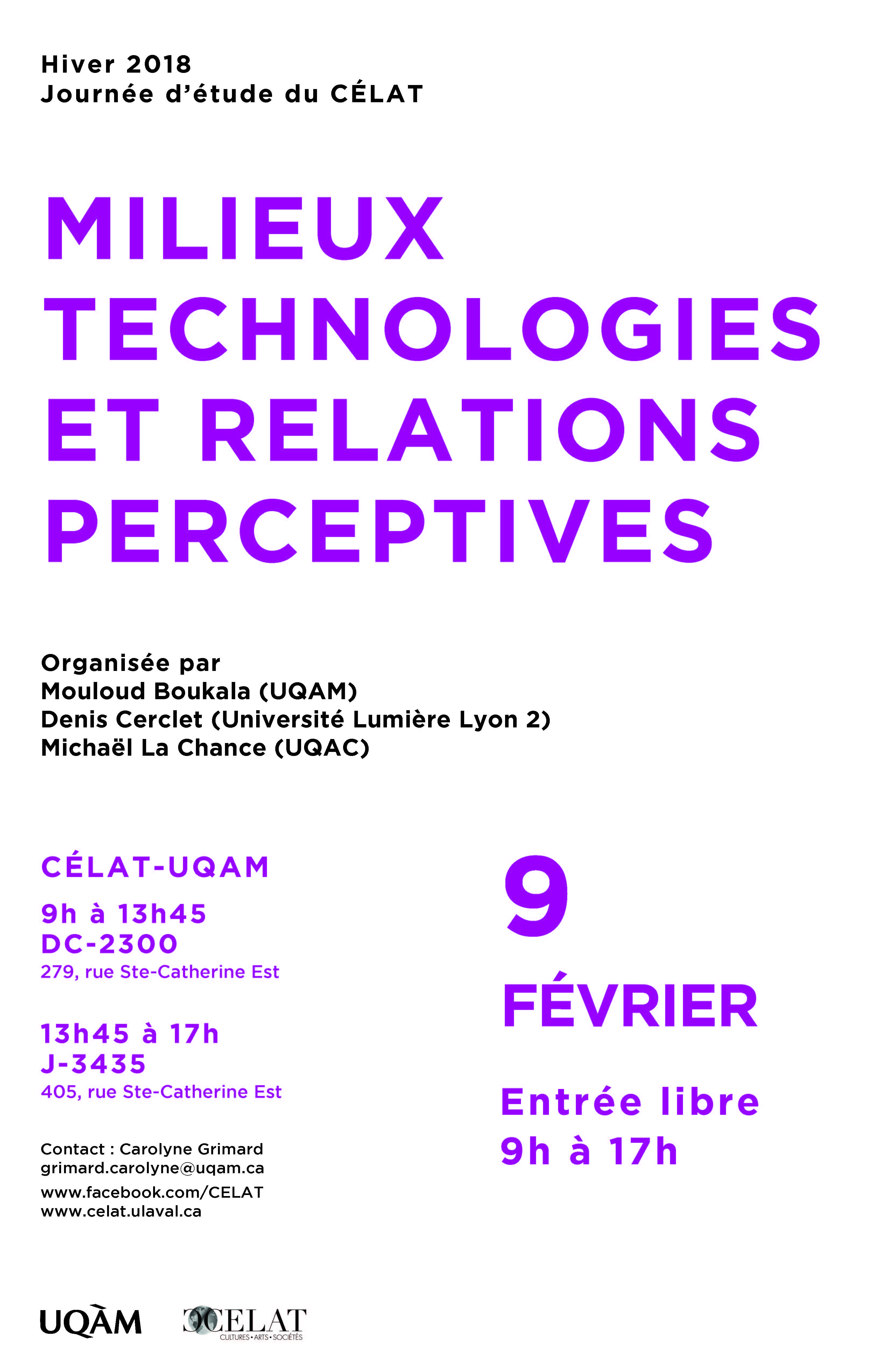 À l’occasion de la venue de Denis Cerclet, professeur au Département d’anthropologie de l’Université Lumière Lyon 2 et titulaire de la Chaire mobile du CELAT, Mouloud Boukala (CELAT-UQAM) et Michaël La Chance (CELAT-UQAC) organisent une journée d’étude intitulée « Milieux, technologies et relations perceptives ». Cette journée se déroulera le vendredi 9 février de 9h à 13h45 au CELAT-UQAM, DC-2300, 279 rue Ste-Catherine Est, et de 13h45 à 17h au J-3435, 405 rue Ste-Catherine Est.