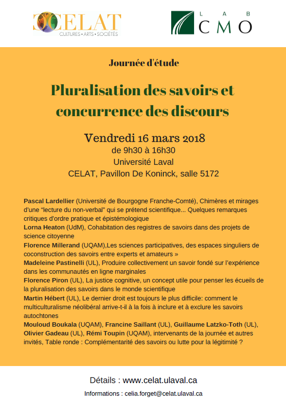 Le vendredi 16 mars de 9h30 à 16h30, Madeleine Pastinelli (CELAT) organise, en collaboration avec le LabCMO, à l’Université Laval, De Koninck, salle 5172, une journée d’étude consacrée à la pluralisation des savoirs et la concurrence des discours. Cette rencontre mêlera conférences et table ronde pour discuter des questions empiriques quant à la façon dont se jouent, en pratiques, les rapports entre différents types de savoirs. Pascal Lardellier, professeur en sciences de l’information et de la communication (Université de Bourgogne), sera l’invité d’honneur de cette journée.