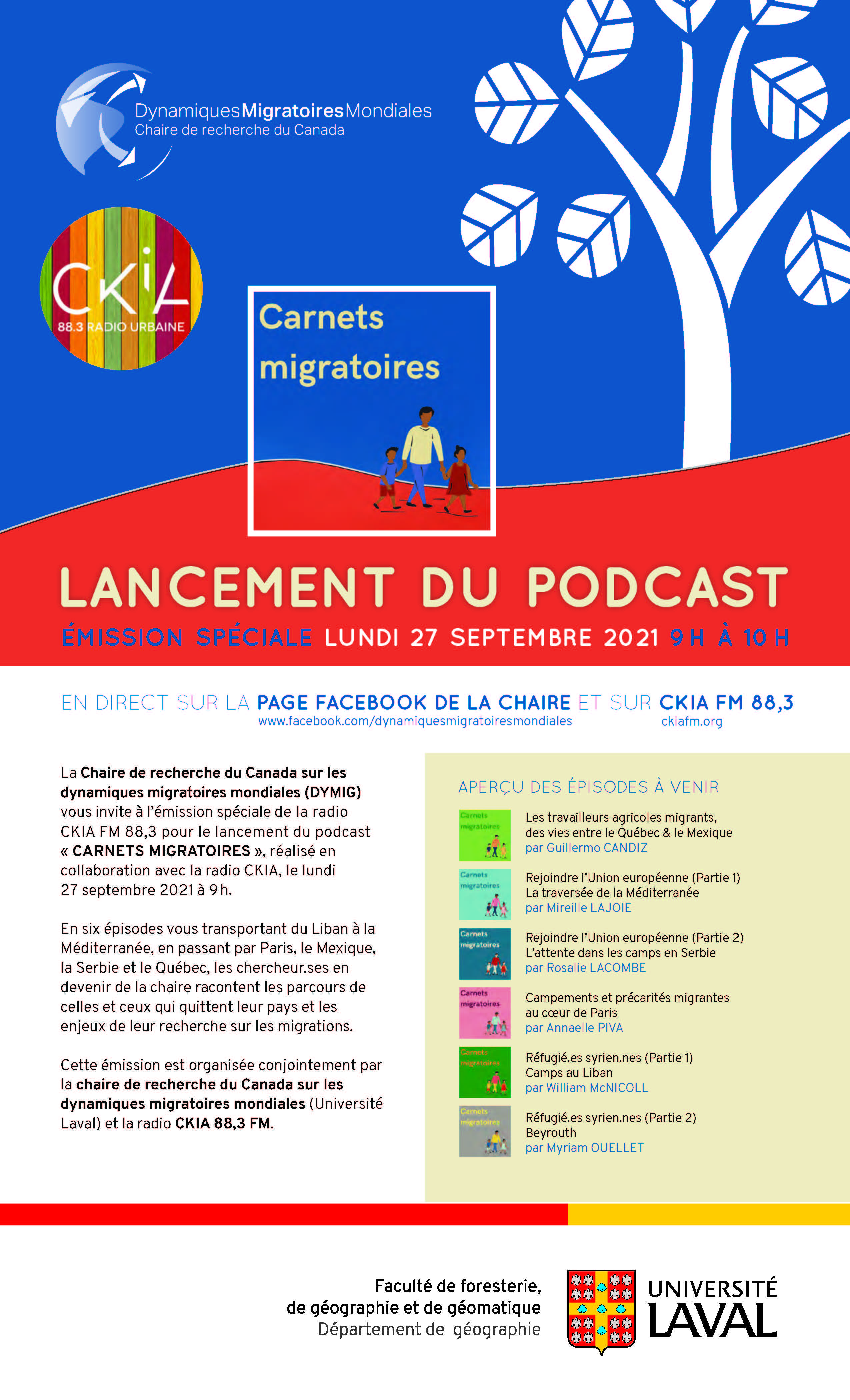 Une émission spéciale soulignant le lancement du balado Carnets migratoires sera diffusée le lundi 27 septembre à 9 h sur la page Facebook de la Chaire de recherche du Canada sur les dynamiques migratoires mondiales (DYMIG) et sur CKIA FM 88,3. Prendront part à la discussion notre membre Danièle Bélanger, plusieurs étudiant.e.s du CELAT qu’elle (co)dirige – Capucine Coustere, Mireille Lajoie, Myriam Ouellet et Annaelle Piva – et les jeunes chercheur.e.s Guillermo Candiz et Rosalie Lacombe. L’émission sera suivie par la diffusion du premier épisode du balado sur CKIA FM 88,3 à 10 h.