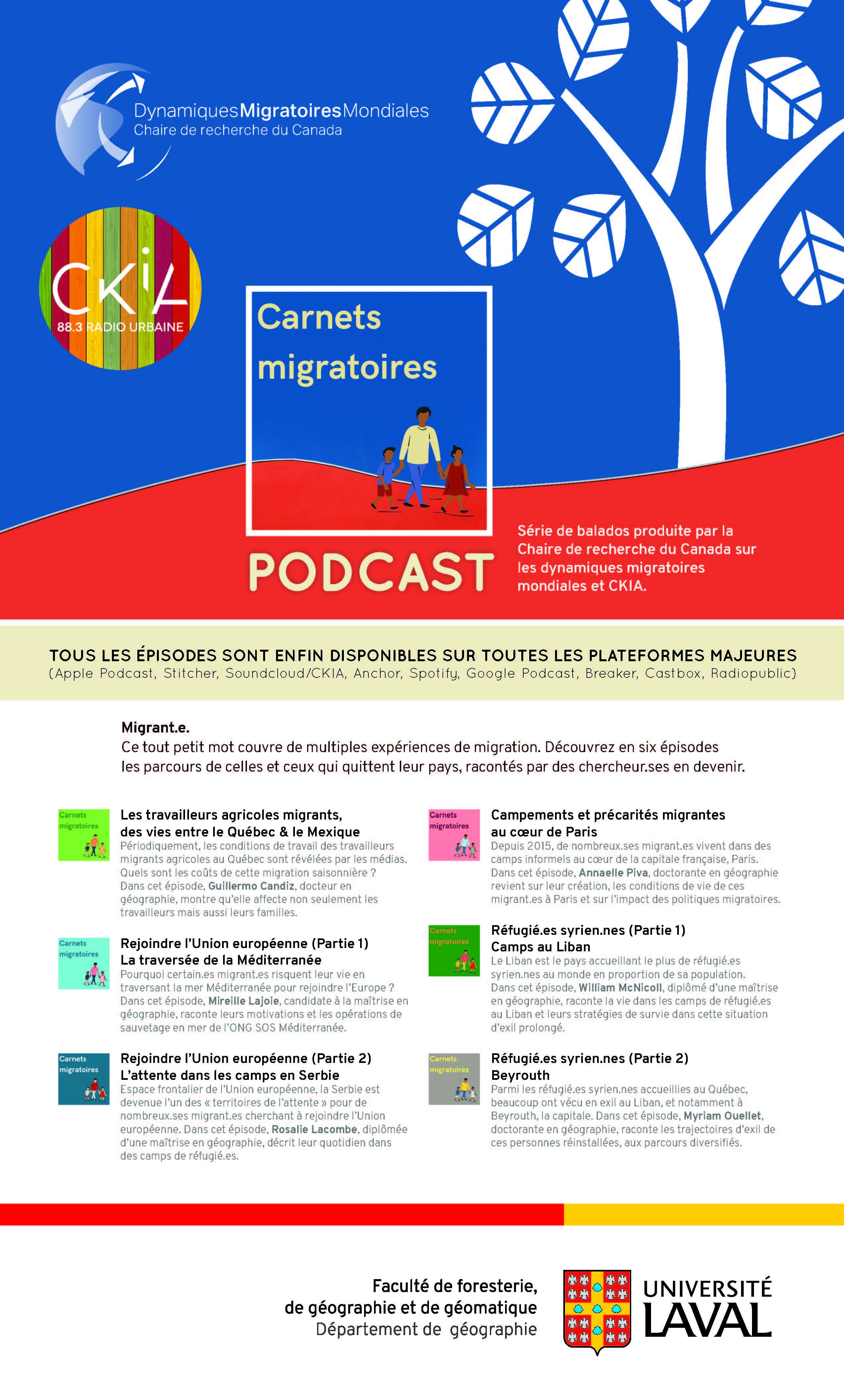 Présentation du balado, réalisé par la Chaire DYMIG, en collaboration avec CKIA FM : « En six épisodes vous transportant du Liban à la Méditerranée, en passant par Paris, le Mexique, la Serbie et le Québec, des chercheur.e.s en devenir de la chaire racontent les parcours de celles et ceux qui quittent leur pays et les enjeux de leur recherche sur les migrations. »