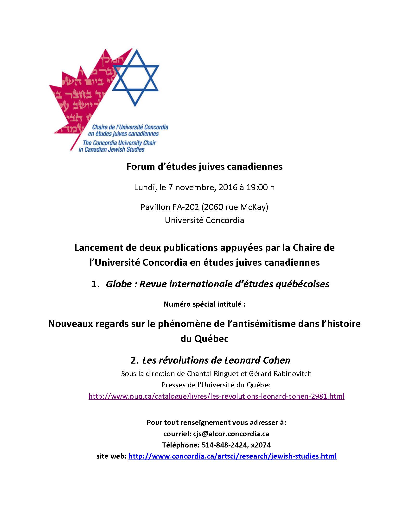 L’événement aura lieu le lundi 7 novembre 2016 à la Chaire d’études juives canadiennes de l’Université Concordia (2060, rue McKay, Montréal) à 19h.