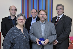 Photo (de gauche à droite): Guillaume Pinson, Vice-doyen à la Faculté des lettres, Francine Saillant, directrice du CÉLAT, Yves Bergeron, président du jury de la médaille, Réginald Auger, récipiendaire de la médaille Luc-Lacourcière, Paul Fortier, Vice-recteur à la recherche et à la création de l’Université Laval.Crédits : Marc Robitaille Photo.