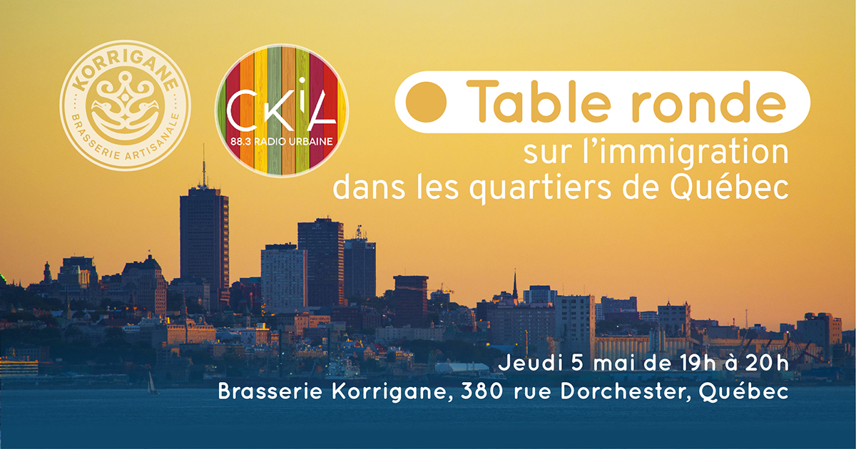 Une table ronde sur l’immigration dans les quartiers de Québec animée par Marjorie Champagne se tiendra le jeudi 5 mai à 19 h à la brasserie artisanale La Korrigane (380 rue Dorchester, Québec). Une diffusion en direct est également prévue sur les ondes de CKIA. Valérie Denais, conseillère en arts et culture à la Ville de Québec, Adèle Garnier, professeure à l’Université Laval et membre du CELAT, Mohammed Intalla, participant de l’exposition Voisins, voisines d’ailleurs, et Véronique Laflamme, porte-parole du FRAPRU, prendront part à la discussion.