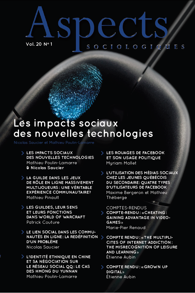 Nicolas Saucier, membre étudiant du CÉLAT et Mathieu Poulin-Lamarre viennent de publier un numéro de la revue Aspects sociologiques intitulé Les impacts sociaux des nouvelles technologies, volume 20, numéro 1. Ce numéro, paru en mars 2013, regroupe neuf articles.