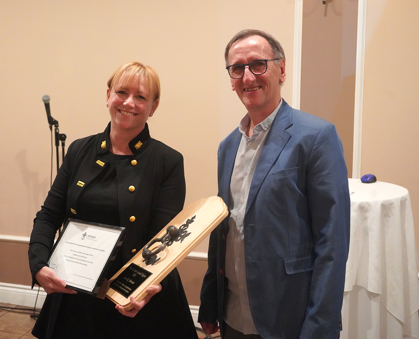 Lors de l’assemblée générale annuelle de l’organisme Amis et propriétaires de maisons anciennes du Québec (APMAQ), le président Louis Tremblay a remis à Lucie K. Morisset (CELAT) le prix Robert-Lionel-Séguin. Octroyée chaque année depuis 1984, cette distinction met en lumière « la contribution exemplaire d’une personne qui, au Québec, a œuvré dans le domaine de la sauvegarde et de la mise en valeur du patrimoine bâti ».