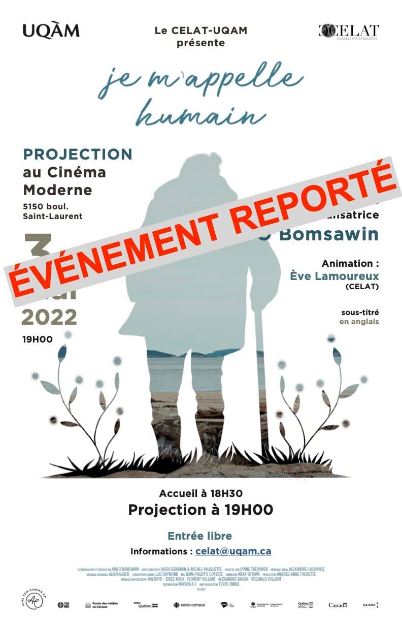 Le mardi 3 mai 2022 à 19 h, vous êtes invité.e.s à une projection du film Je m’appelle humain, en présence de la réalisatrice Kim O’Bomsawin. L’activité, animée par Ève Lamoureux (CELAT), se déroulera au Cinéma moderne (5150, boul. Saint-Laurent, Montréal). Entrée libre. Les membres du CELAT sont invité.e.s à réserver leur place par courriel à l’adresse celat@uqam.ca.