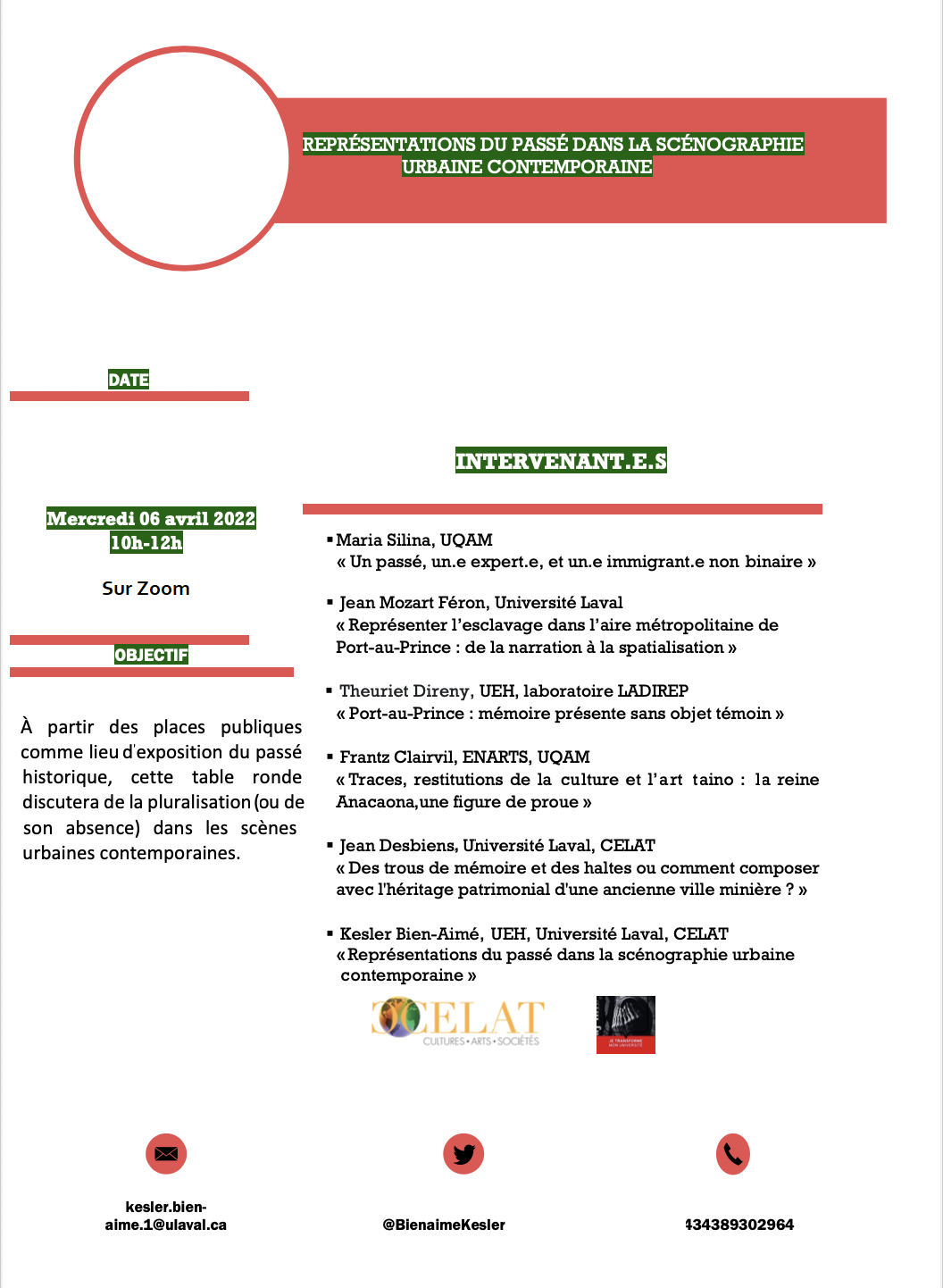 Dans le cadre de sa bourse de mi-parcours de 3e cycle du CELAT, Kesler Bien-Aimé, doctorant en ethnologie et patrimoine à l’Université Laval sous la direction de Laurier Turgeon, organise, le mercredi 6 avril 2022, de 10 h à 12 h, une table ronde virtuelle portant sur les « Représentations du passé dans la scénographie urbaine contemporaine ». L’activité, animée par Kesler Bien-Aimé, rassemblera cinq autre participant.e.s, dont plusieurs sont ou étaient affilié.e.s à notre centre : Jean Desbiens (membre étudiant du CELAT-UL, dirigé par Réginald Auger), Theuriet Direny (UEH), Jean Mozart Féron (Université Laval), Frantz Clairvil (ENARTS, UQAM) et Maria Silina (UQAM).