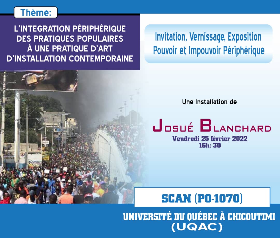 Josué Blanchard, membre étudiant du CELAT sous la direction de Constanza Camelo Suarez, vous invite, le vendredi 25 février 2022 dès 16 h 30, au vernissage de son exposition L’intégration périphérique des pratiques populaires à une pratique d’art d’installation contemporaine. Celle-ci prend la forme d’une « installation vidéo interactive qui met en relief le concept centre-périphérie et qui dénonce l’ingérence des forces interventionnistes occidentales dans les affaires interne d’Ayiti (Manman Libète) ». L’événement, qui se déroulera à l’Université du Québec à Chicoutimi, au SCAN (PO-1070), marque, pour Josué Blanchard, la fin d’une maîtrise en arts, volet recherche-création, consacrée notamment à l’étude des « pratiques populaires mettant en cause des phénomènes sociopolitiques perpétrés en Ayiti depuis plus de trois décennies ».